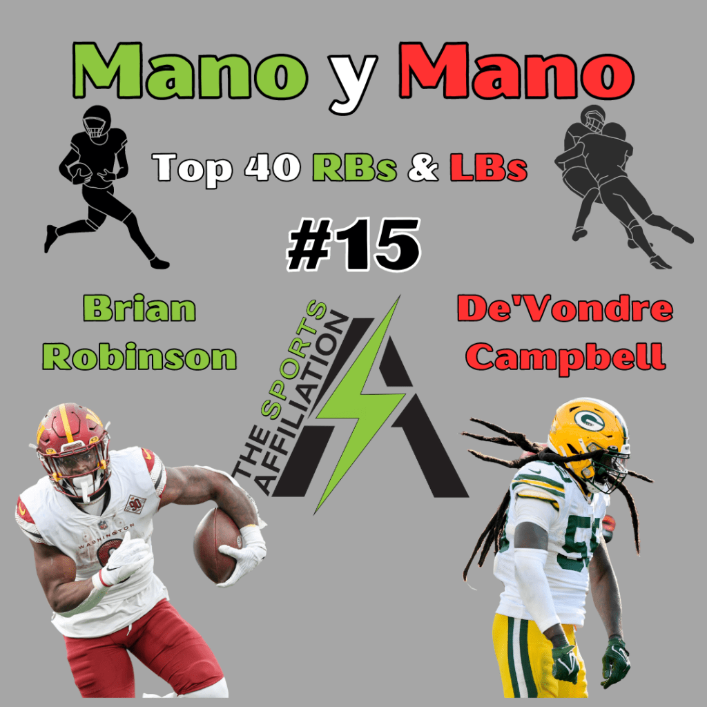 Brian Robinson is fully healthy entering his second season. He looks crisp with his cuts in preseason action and could be set for the most snaps in a timeshare in Washington. The running back (RB) room for the Commanders has a great 1-2 combo and both B. Robinson and Antonio Gibson are capable of having big days. Gibson is ranked 33rd in Mano y Mano Top 40, and Robinson gets the edge due to more projected playing time. Despite missing five games he started nine last year, and put up 857 yards from scrimmage and 3 touchdowns (TD). He snagged only 9 receptions last year and although he will have more this year, do not expect a large volume of passes to Robinson.