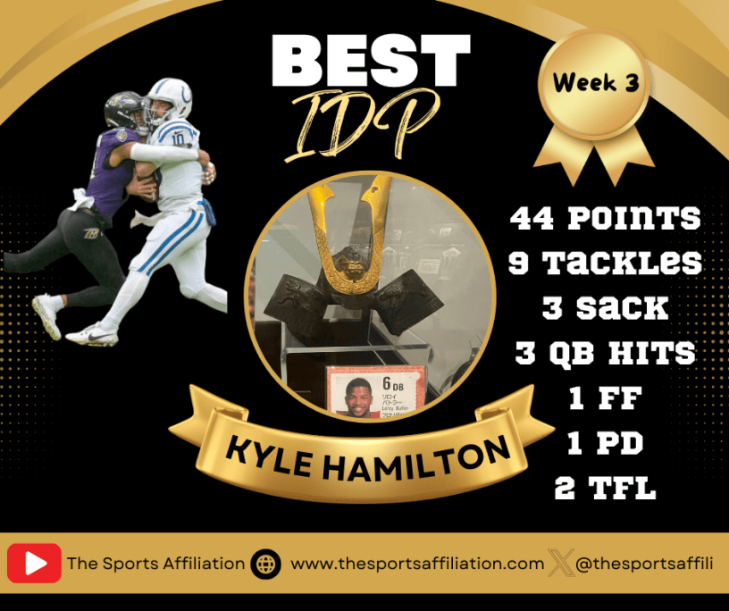 The IDP player of the week remains in the AFC North. For the third week in a row a team from the AFC North is the player of the week. This week it is Baltimore Raven Safety, Kyle Hamilton. He just edged out Myles Garrett with this all around performance! He was on Colts quarterback Gardner Minshew this game with 3 sacks! He also had 1 forced fumble and 1 pass defended to add to his 9 combined tackles.