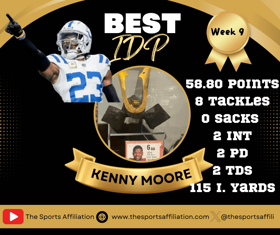 Kenny Moore is the LeRoy Butler IDP Player of Week 9! He had a career game against the Carolina Panthers this past Sunday. He had eight combined tackles, which is an excellent day for most IDPs, however Moore went above and beyond for this game. He made sure the Colts won the game with not one, but two ‘Pick Sixes’ an interception returned for a touchdown. He haas three career touchdowns, and two of them came on Sunday. A performance of a lifetime and the AFC claims the best scoring IDP.