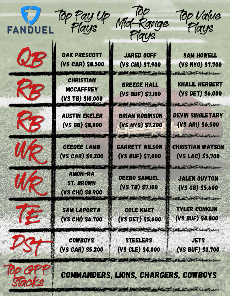 Daily Fantasy - All Sports, Sports Betting NFL DFS Week 11 Cheat Sheet | FanDuel Main Slate Date: November 18, 2023Author: Coach Craig 0 Comments Share this: Click to share on X (Opens in new window) X Click to share on Facebook (Opens in new window) Facebook Like Loading... Related