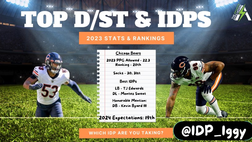 The Bears actually move up one spot in the 2024 predictions to 19th. They have some absolute studs at every level for IDP purposes, but one must ask… what has changed with the Chicago Bears defensively? Head Coach Matt Eberflus brought in an All-Pro safety in Kevin Byard, which should help. Although in 2023 Byard was on a defense (Philadelphia Eagles) that allowed more passing touchdowns than the Bears did.