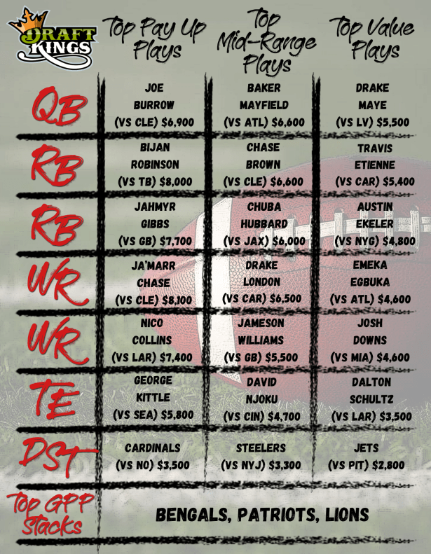 Fantasy Football Advice, Football, Sports Betting NFL DFS Week 1 Cheat Sheet | DraftKings Main Slate Date: September 6, 2025Author: Coach Craig 0 Comments Share this: Click to share on X (Opens in new window) X Click to share on Facebook (Opens in new window) Facebook Like Loading... Related