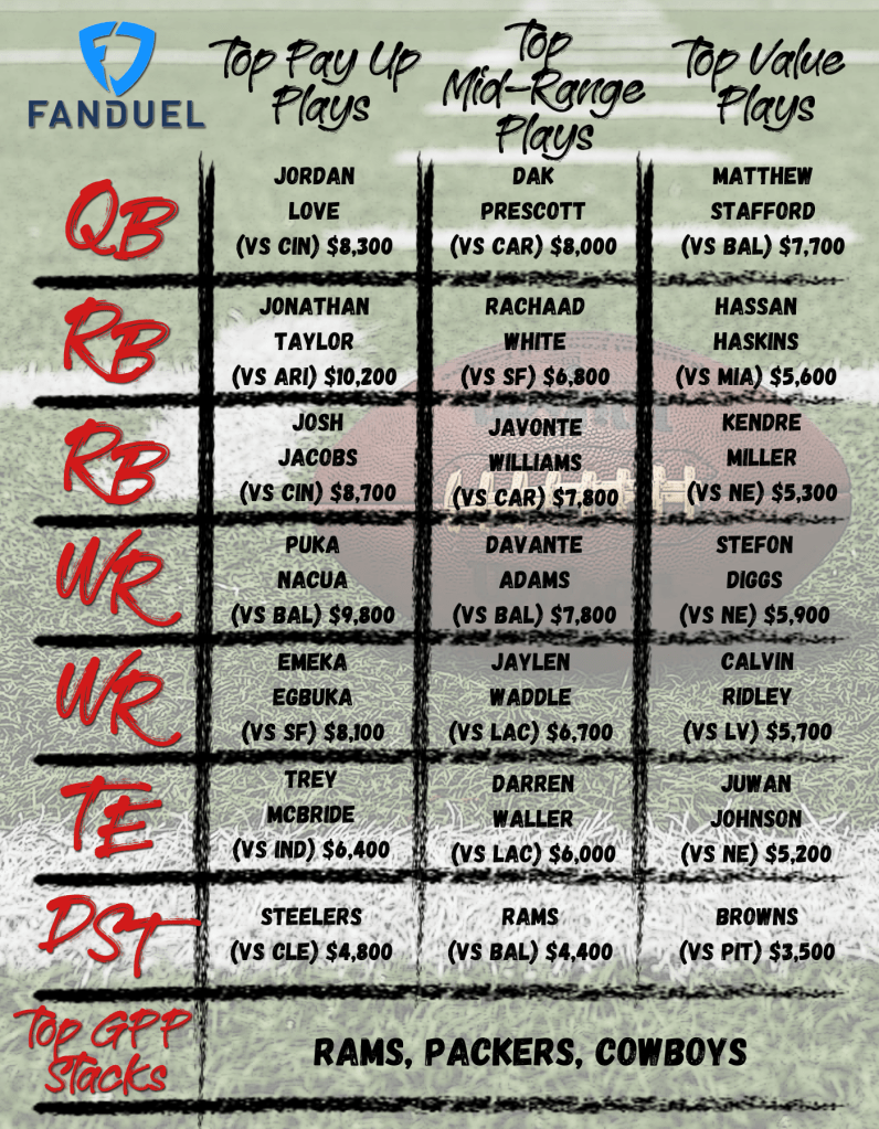 Daily Fantasy - All Sports, Football, Sports Betting NFL DFS Week 6 Cheat Sheet | FanDuel Main Slate Date: October 11, 2025Author: Coach Craig 0 Comments Share this: Click to share on X (Opens in new window) X Click to share on Facebook (Opens in new window) Facebook Like Loading... Related