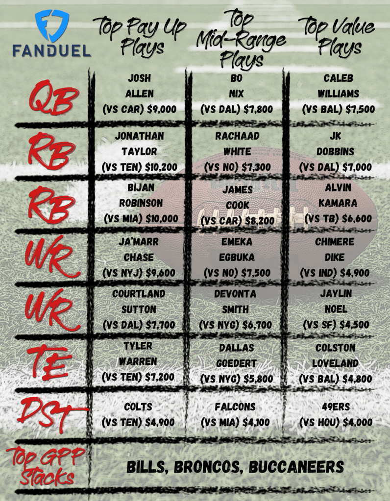 Daily Fantasy - All Sports, Football, Sports Betting NFL DFS Week 8 Cheat Sheet | FanDuel Main Slate Date: October 24, 2025Author: Coach Craig 0 Comments Share this: Click to share on X (Opens in new window) X Click to share on Facebook (Opens in new window) Facebook Like Loading... Related