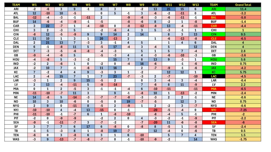 Sports Betting A Discussion of Chaos in FF Date: December 6, 2025Author: @prof_fantasy1 0 Comments Figures below are Targets by Teams W1 to 13, Total Targets, Late vs Early Season Target/Team Change, Weekly Team Targets vs League Per Week Positive/Negative, and Average above or below this average. Share this: Click to share on X (Opens in new window) X Click to share on Facebook (Opens in new window) Facebook Like Loading... Related