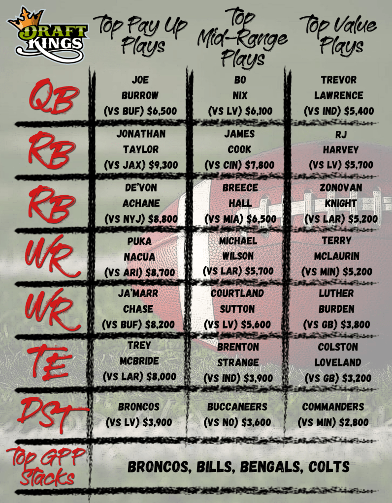 Fantasy Football Advice, Football, Sports Betting NFL DFS Week 14 Cheat Sheet | DraftKings Main Slate Date: December 6, 2025Author: Coach Craig 0 Comments Share this: Click to share on X (Opens in new window) X Click to share on Facebook (Opens in new window) Facebook Like Loading... Related