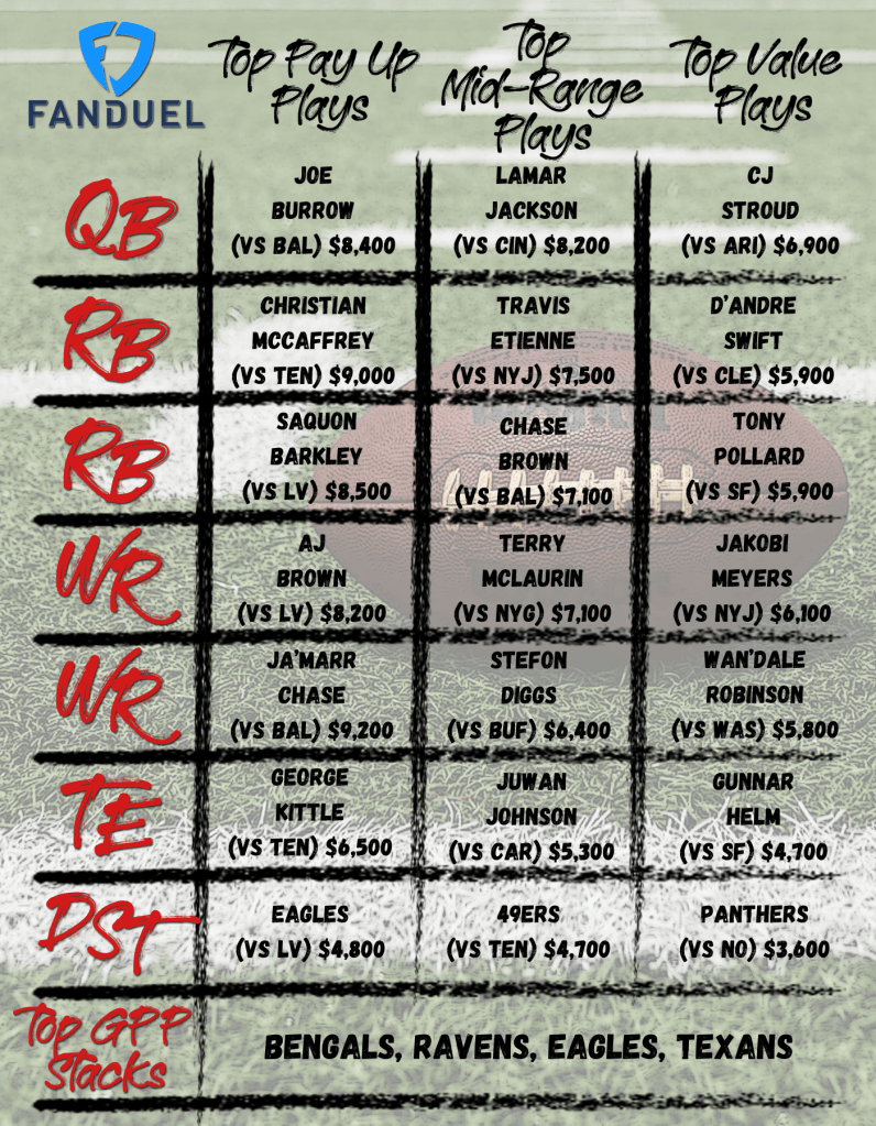 Daily Fantasy - All Sports, Football, Sports Betting NFL DFS Week 15 Cheat Sheet | FanDuel Main Slate Date: December 13, 2025Author: Coach Craig 0 Comments Share this: Click to share on X (Opens in new window) X Click to share on Facebook (Opens in new window) Facebook Like Loading... Related