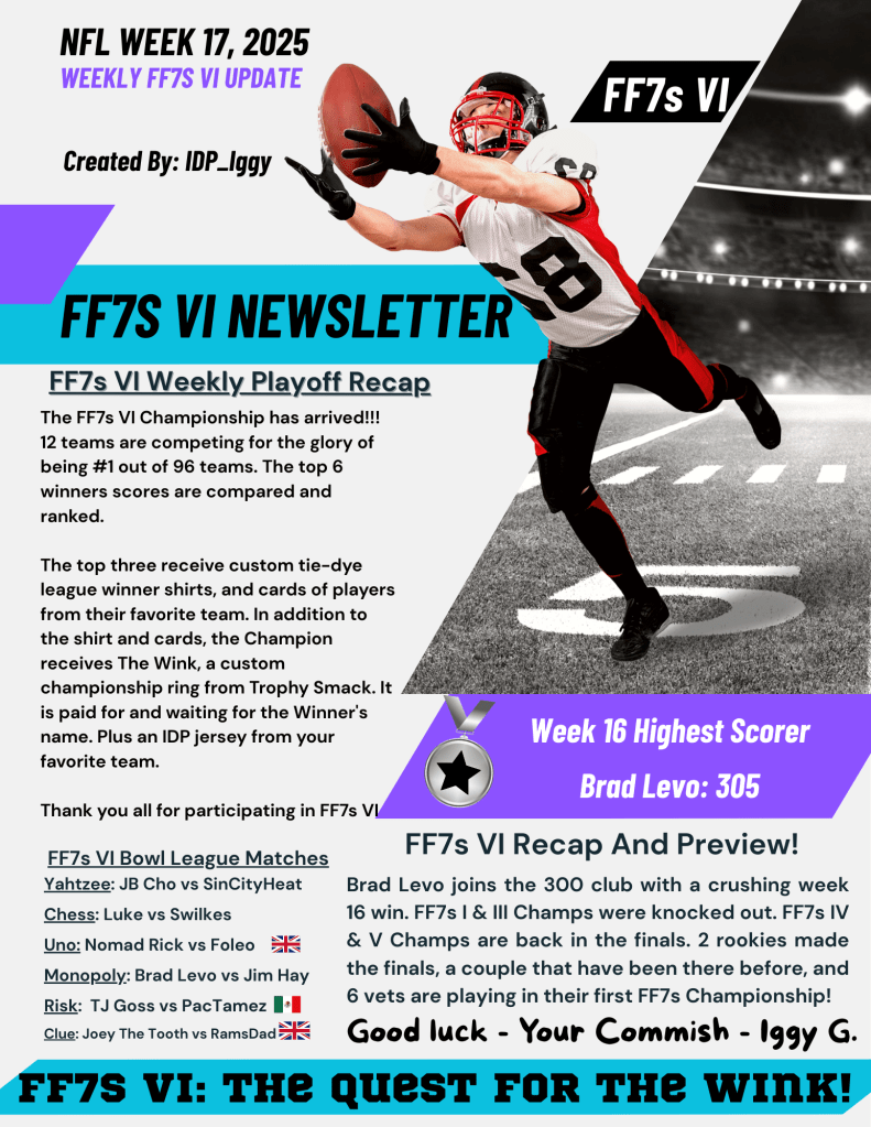 The FF7s VI Championship has arrived!!! 12 teams are competing for the glory of being #1 out of 96 teams. The top 6 winners scores are compared and ranked. The top three receive custom tie-dye league winner shirts, and cards of players from their favorite team. In addition to the shirt and cards, the Champion receives The Wink, a custom championship ring from Trophy Smack. It is paid for and waiting for the Winner’s name. Plus an IDP jersey from your favorite team.